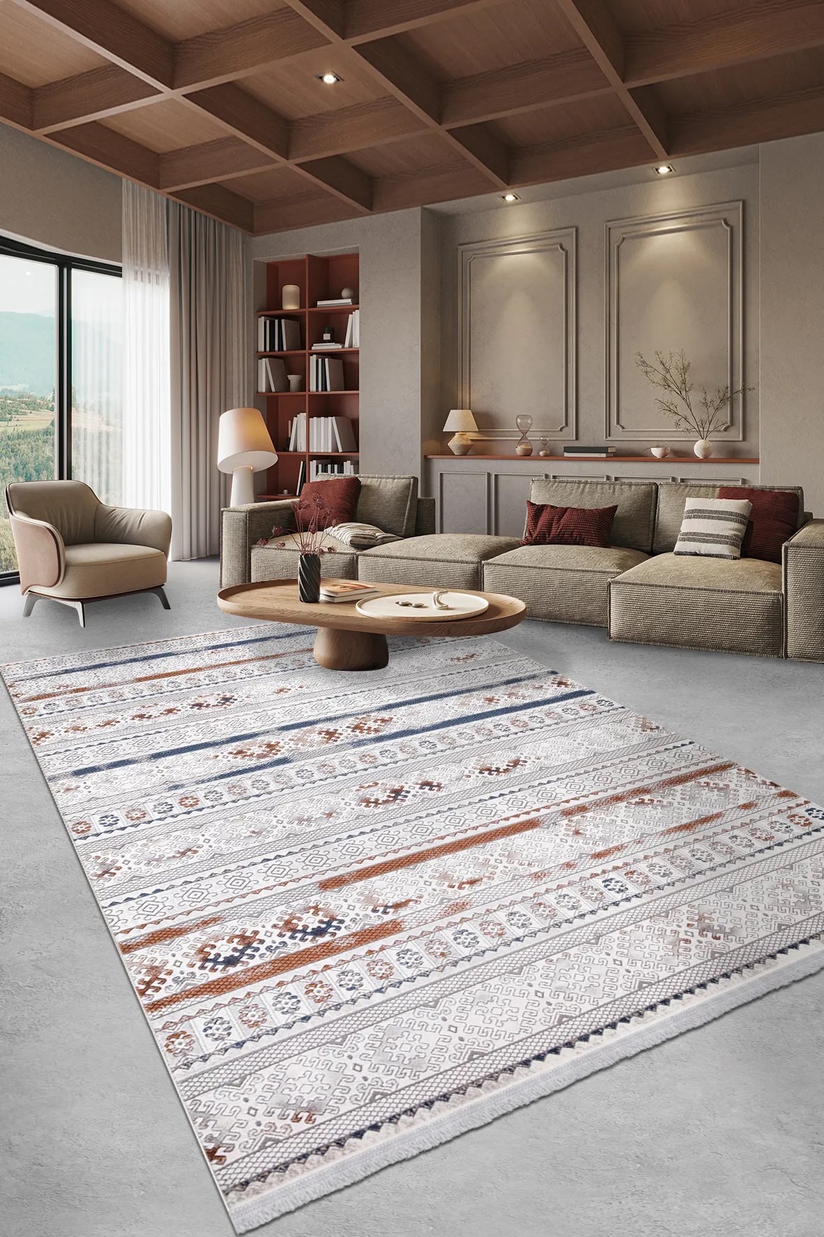 VALORİA-Bej/Mavi/Turuncu - Özel Ölçü-Salon,Oturma Odası ve Koridor Halısı-Robot Süpürgeye Uyumlu-Kolay Temizlenebilir-Uygun Fiyat